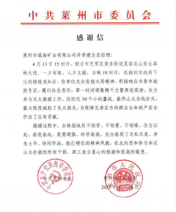 ÈÕǰ£¬À³ÖÝÊÐÈ𺣿óÒµÓÐÏÞ¹«Ë¾ÊÕµ½ÁËÀ³ÖÝÊÐίÊÐÕþ¸®ËÍÀ´µÄллÐÅ£¬¶ÔÆóÒµÆð¾¢ÏìÓ¦Õкô£¬ÍÆÐÐÉç»áÔðÈΣ¬ÕÙ¼¯¾«º·Á¦Á¿ÆË¾ÈÉÁÖɽ»ð×ö³öµÄТ˳ÌåÏÖлл¡£